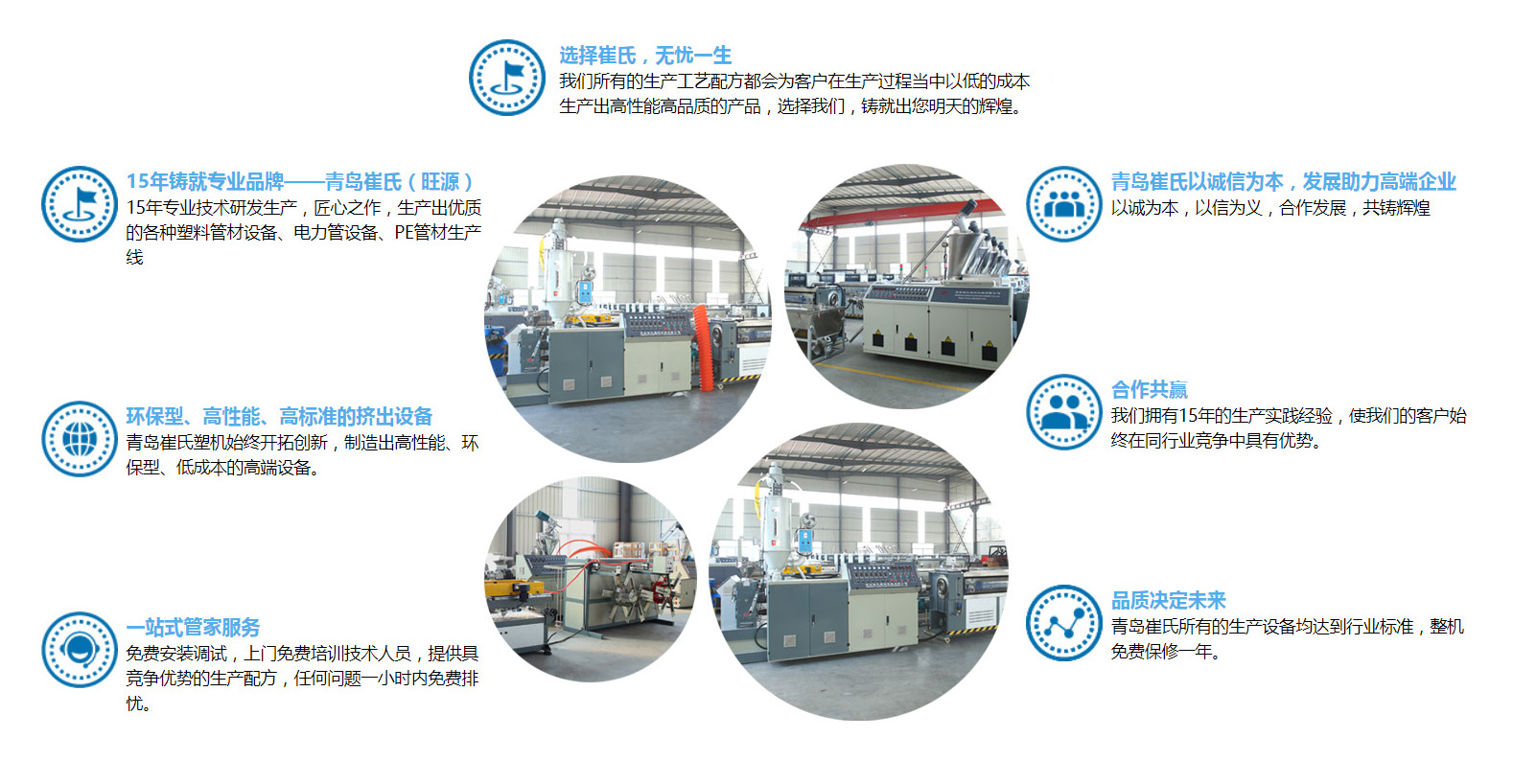 青島崔氏塑料機(jī)械有限公司位于青島膠州市膠西工業(yè)園區(qū),香港路與同三高速交匯處,距膠東國際機(jī)場20多公里,地理位置便利,占地面積20000多平方米,是一家集生產(chǎn)與研發(fā)各種塑料制品設(shè)備的環(huán)保型企業(yè)。我公司主營預(yù)應(yīng)力波紋管設(shè)備、雙壁波紋管設(shè)備、電力管設(shè)備、塑料波紋管設(shè)備、汽車線束波紋管設(shè)備、PPR、PE、PVC、PERT管材設(shè)備及其它各種管材設(shè)備、塑料型材設(shè)備、塑料蜂窩板設(shè)備。公司技術(shù)力量雄厚,開發(fā)能力強(qiáng),生產(chǎn)工藝先進(jìn),以開發(fā)新材料,研制新工藝為基礎(chǔ)生產(chǎn)各種塑料擠出設(shè)備。公司產(chǎn)品遍布全國各地,并且遠(yuǎn)銷歐州,獨(dú)聯(lián)體,南美洲,中東,東南亞,大洋州,非洲等許多國家和地區(qū)。